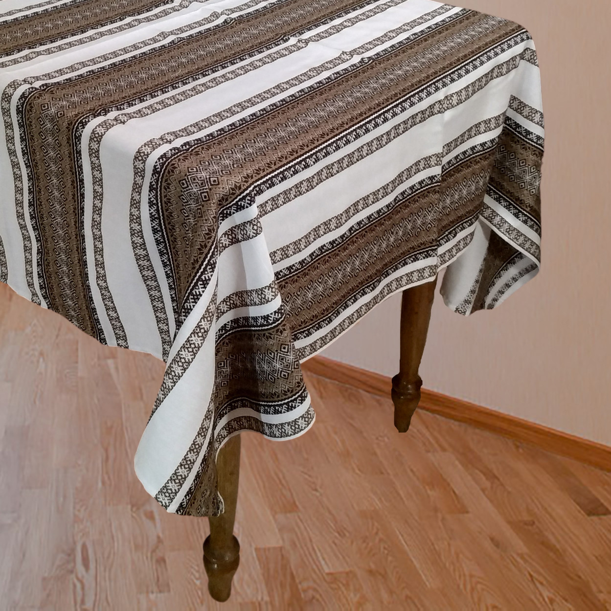 Скатертина прямокутна, з українським орнаментом, виткана на жаккардових станках, які тонко відтворюють кропітку роботу вишивальниці. Кожна скатертина має свій неповторний візерунок. Наші скатертини невибагливі в догляді: легко перуться і не потребують прасування.